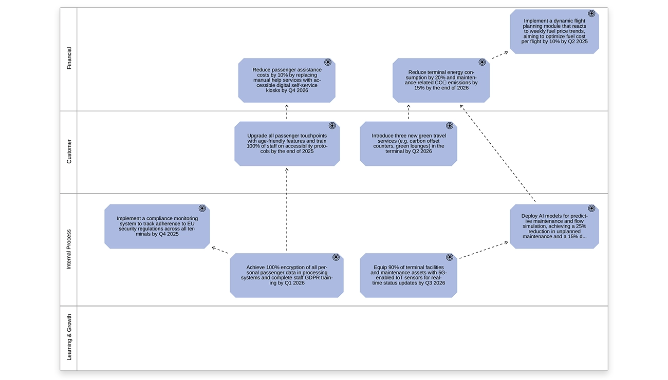 Set clear, architecture-driven goals grounded in business priorities. Link each objective to the teams and systems responsible for execution, with full traceability from strategy to delivery.